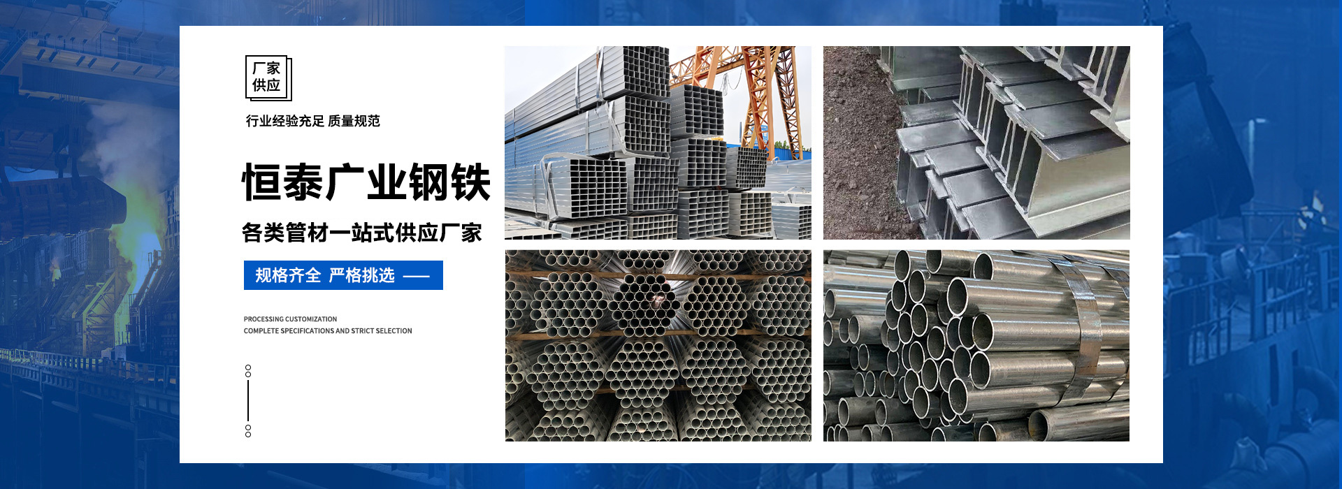 天津恒泰廣業(yè)鋼鐵有限公司是一家從事鋼鐵流通企業(yè)。本公司經(jīng)過多年的努力已在華東、華北、華南地區(qū)建立起良好的信譽(yù),不僅在同行市場營銷上取得成績,而且將直銷作為公司主要銷售模式,為直接用戶提供優(yōu)惠價(jià)格、合格品質(zhì)的鋼材資源,直接降低了廣大用戶的采購成本,贏的廣大鋼材采購商的信任。 天津恒泰廣業(yè)鋼鐵有限公司主營大棚管,鍍鋅管,鍍鋅方矩管,鍍鋅帶圓管,鍍鋅帶方矩管,鍍鋅H型鋼,鍍鋅角鋼,鍍鋅槽鋼,鍍鋅扁鋼,鍍鋅圓鋼等.供應(yīng)溫室大棚,幕墻公司,公路設(shè)施,鋼構(gòu)工程用材, 產(chǎn)品規(guī)格范圍: 鍍鋅鋼管4分-10寸,鍍鋅方管:20*20—800*800,選擇天津恒…